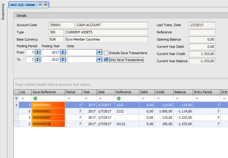 Θέλετε να αποθηκεύσετε τις συναλλαγές σας χωρίς να ενημερώσετε μόνιμα το σύστημα; Είστε αβέβαιοι για τα αποτελέσματα; Έχουμε τη λύση στο πρόβλημα σας! Οι εφαρμογές της Eurosoft είναι σε θέση να λειτουργούν και να διαχειρίζονται Αποθηκευμένες Συναλλαγές χωρίς να είναι αναγκαία η μόνιμη ενημέρωση του συστήματος, παρέχοντας στον χρήστη τη δυνατότητα επεξεργασίας ή και διαγραφής των Αποθηκευμένων Συναλλαγών στο μέλλον. Μέχρι τώρα, κάθε φορά που ένας χρήστης εισήγαγε μια νέα συναλλαγή, έπρεπε να ενημερώσει μονίμως το σύστημα για να εμφανιστούν οι αλλαγές, και εάν η συναλλαγή ήταν λανθασμένη, ο χρήστης έπρεπε να ξαναχρεώσει και να πιστώσει ανάλογα για να διορθώσει τα λανθασμένα τελικά ποσά. Ωστόσο, για το Eurosoft τα πράγματα έχουν αλλάξει! Έχουμε δημιουργήσει έναν νέο τρόπο χειρισμού των συναλλαγών σας, ο οποίος αλλάζει τον παραδοσιακό τρόπο αντιμετώπισης και αντικατάστασης λαθών. Όλες οι αποθηκευμένες συναλλαγές περιλαμβάνονται σε όλες τις λειτουργίες του συστήματος, π.χ. Δοκιμαστικά Υπόλοιπα, Λεπτομερείς Αναφορές, Αναφορά Vat, Συμφωνία Τράπεζας, Έκθεση Διαχείρισης, Εκθέσεις Προϋπολογισμού, Δηλώσεις κλπ., προκειμένου οι χρήστες να αποφασίσουν εάν επιθυμούν να διατηρήσουν ορισμένες συναλλαγές ή όχι. Δείτε τα παρακάτω παραδείγματα!